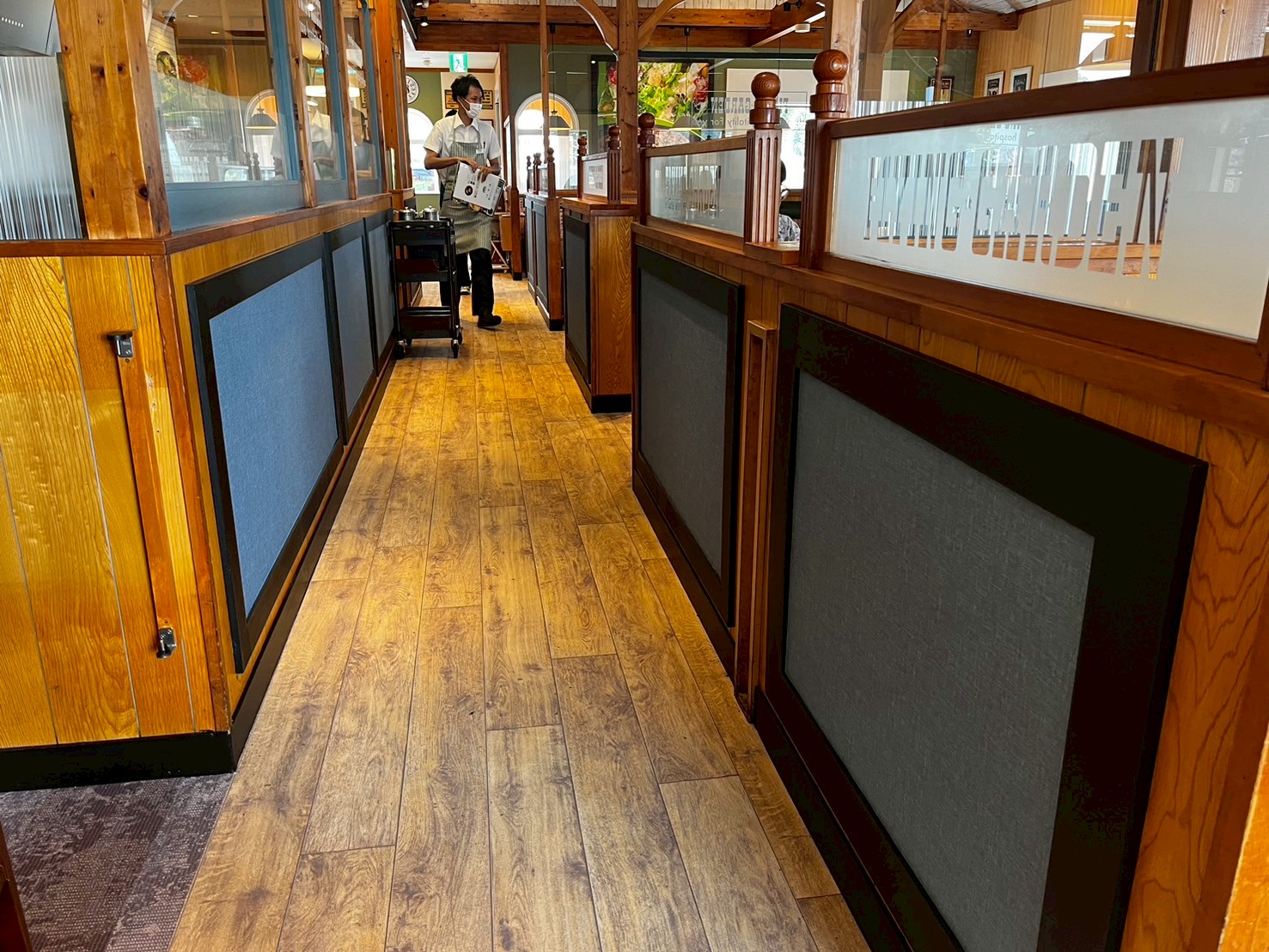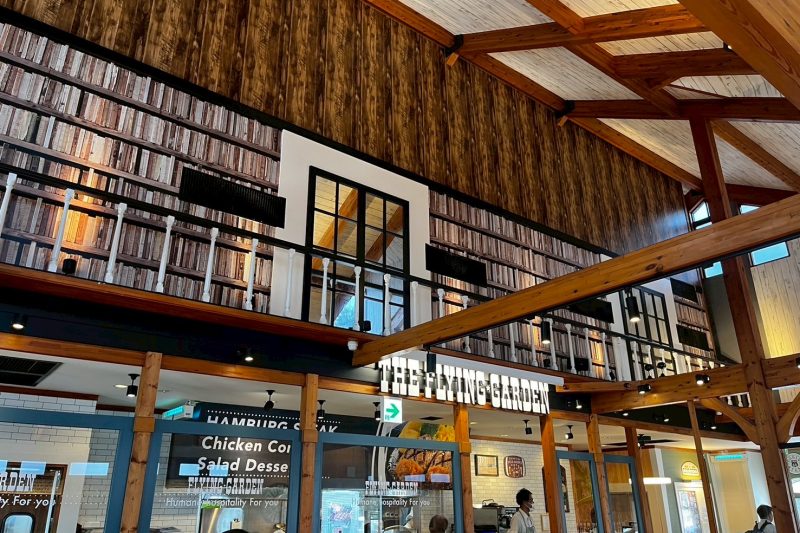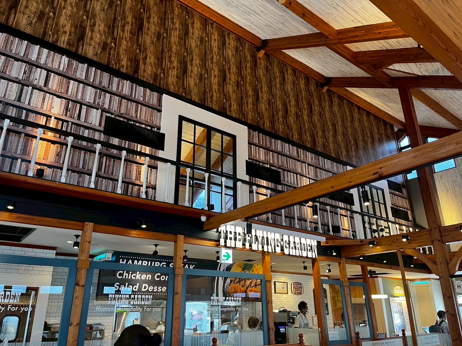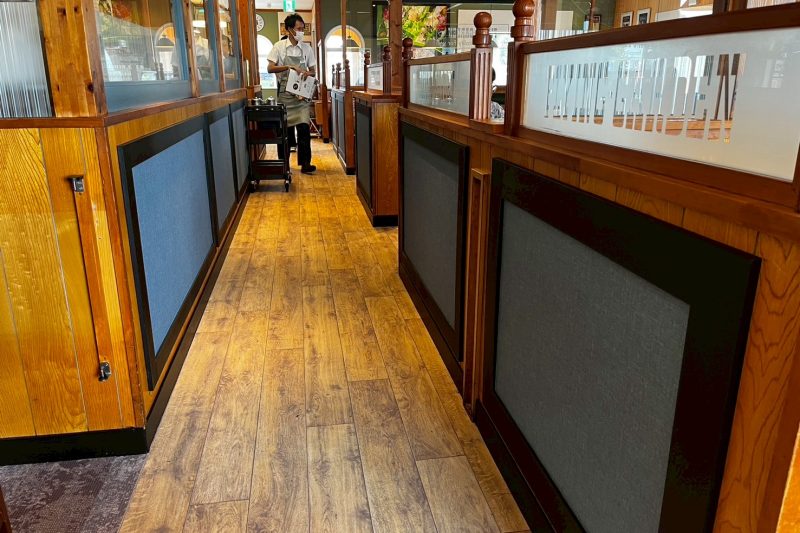 店内を見渡すと高くてきれいな天井と見てて楽しい壁面のインテリア フライングガーデンの店名が入ったパーテーションガラス、そして滑らない床 さらに利用しやすく、素敵に仕上がっています。